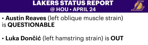 北京时间4月24日,湖人2-0领先火箭,官方更新G3伤病报告。里夫斯(左侧腹外斜肌拉伤)状态升级为出战成疑,G3有望复出。东契奇继续缺战,何时复出仍是最大疑问。