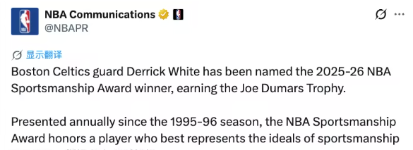 北京时间4月24日,NBA官方宣布,凯尔特人后卫德里克-怀特荣获2025-26赛季NBA体育道德风尚奖,获得乔-杜马斯奖杯。