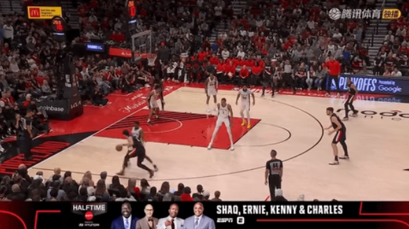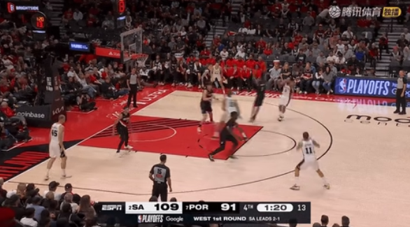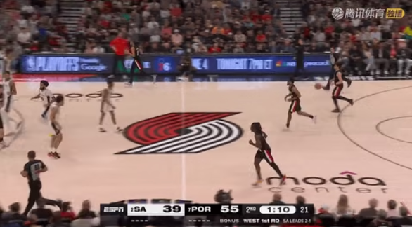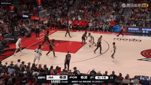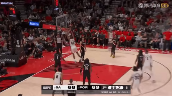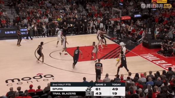 开拓者直到第三节还剩3分51秒才靠霍勒迪三分打破得分僵局并反超。节末,从还剩1分30秒到节末压哨,马刺连续5次进攻得分,文班亚马压哨补扣将比分追成74:74。