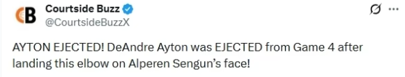 北京时间4月27日,NBA季后赛,火箭对阵湖人。第三节艾顿肘击申京面部,裁判回看录像后升级为二级恶意犯规,将其驱逐。
