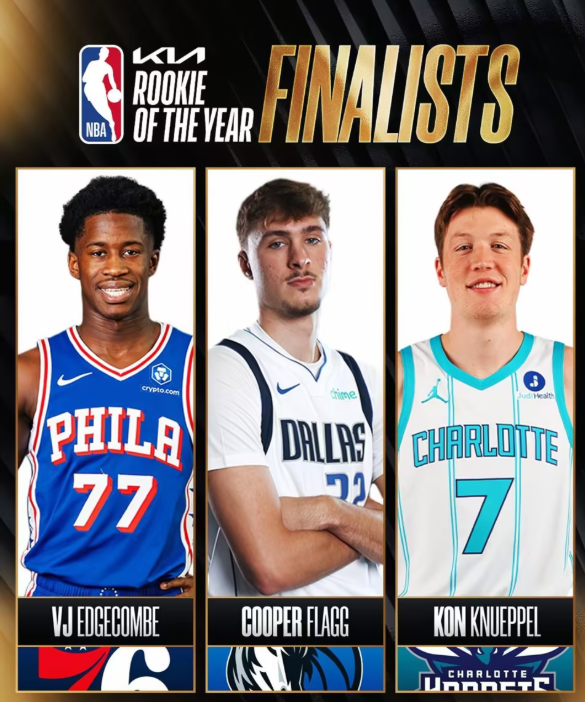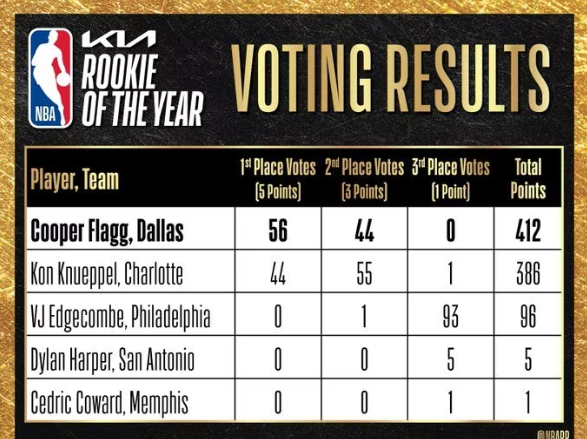 由100名成员组成的全球媒体评审团,投票选出了2025-26赛季起亚NBA年度最佳新秀。弗拉格得到56张第一选票,总分412分,克努佩尔得到44张第一选票,总分386分。本届前两名之间的得分差距为26分,是自2002-03赛季现行投票规则启用以来的历史第二小分差,仅次于2021-22赛季的15分差距(巴恩斯击败莫布利)。