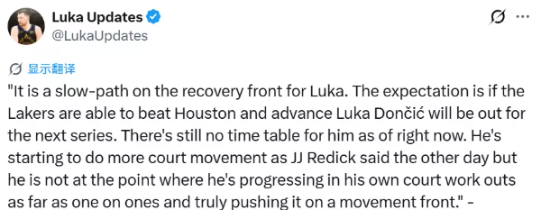 Shams在ESPN节目中表示:“东契奇的恢复进度非常缓慢。目前各方预估:一旦湖人淘汰火箭晋级,东契奇也将缺席下一轮系列赛。他现阶段仍没有明确的复出时间表。正如主帅雷迪克近日所说,他虽然增加了场上活动量,但个人训练进度有限,还无法进行一对一对抗,也不能完成高强度的移动发力训练。”