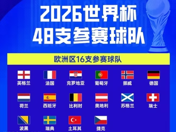 如此一来,欧洲区参加世界杯的16支队伍全部确定。其中,英格兰、法国、克罗地亚、葡萄牙、挪威、德国、荷兰、瑞士、苏格兰、西班牙、奥地利、比利时这12队通过欧洲区预选赛直通世界杯。而捷克、土耳其、瑞典和波黑则是通过附加赛涉险过关。