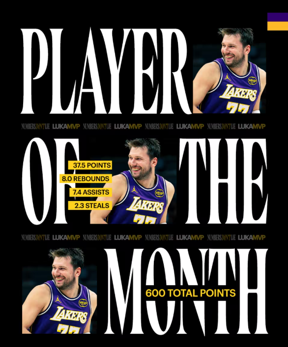 这位明星后卫场均还贡献8.0个篮板、7.4次助攻,投篮/三分/罚球命中率分别为49.2%、39.2%、79.4%。湖人3月取得15胜2负(东契奇出战时14胜2负),27岁的他甚至在防守端也获得认可——凭借场均2.3次抢断,他还入选了月最佳防守球员提名。