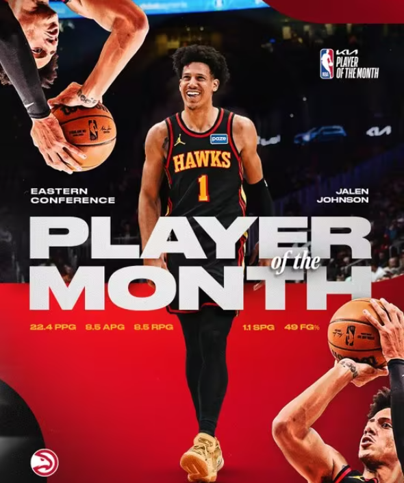 老鹰近期同样是联盟状态最火热的球队之一,约翰逊在球队近期的成功中扮演了关键角色。这是他生涯首次当选月最佳球员。老鹰3月战绩13胜2负(约翰逊出战时11胜2负),他场均得到22.4分、8.5个篮板、8.5次助攻,投篮命中率48.9%,三分命中率39.2%,罚球命中率80.7%。