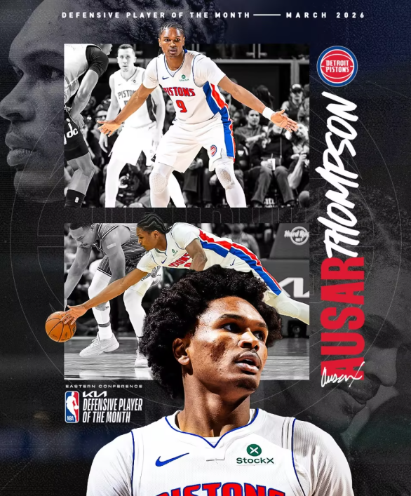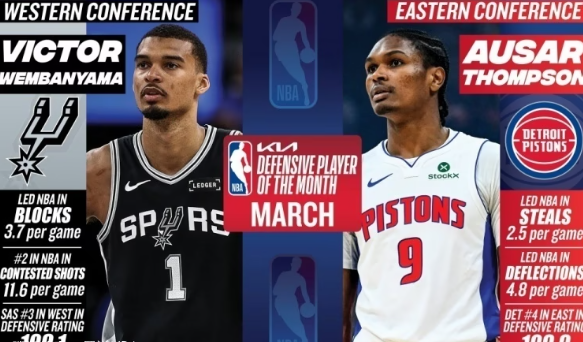 文班亚马是本赛季唯一一位三次当选月最佳防守球员的球员;活塞锋线奥萨尔-汤普森则与他一同成为本赛季仅有的两位多次获此奖项的球员——汤普森也当选了3月东部最佳防守球员,他曾在一月拿下过东部月最佳防守球员。
