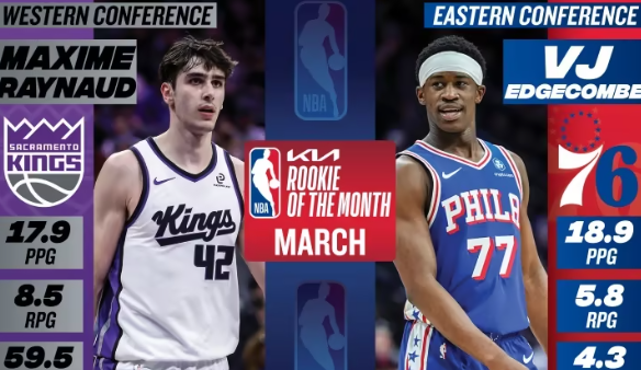 76人后卫VJ-埃奇库姆当选东部3月最佳新秀,埃奇库姆的当选,终结了黄蜂锋线康-克努佩尔本赛季包揽东部全部月最佳新秀的势头。克努佩尔此前已拿下10/11月、12月、1月及2月的东部月最佳新秀。