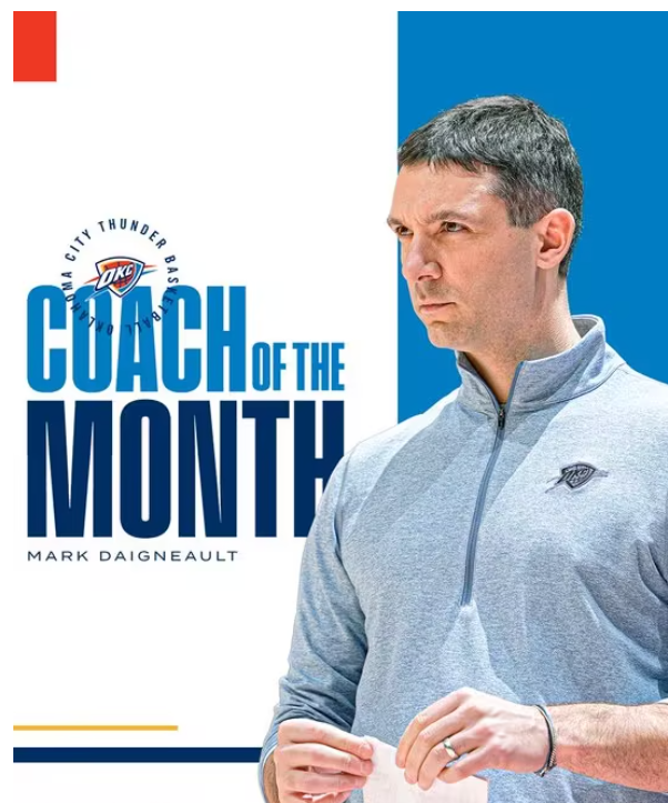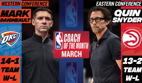 雷霆队主帅马克-戴格诺特当选西部3月最佳教练,老鹰队主帅奎因-斯奈德则斩获东部该项荣誉。