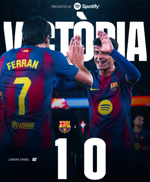 西甲第33轮,巴萨主场1-0战胜塞尔塔,取得联赛8连胜,积82分继续领跑,领先第2名皇马9分。坎塞洛伤退,亚马尔造点 点射 伤退,比赛因看台医疗状况一度中断,费兰进球越位无效。