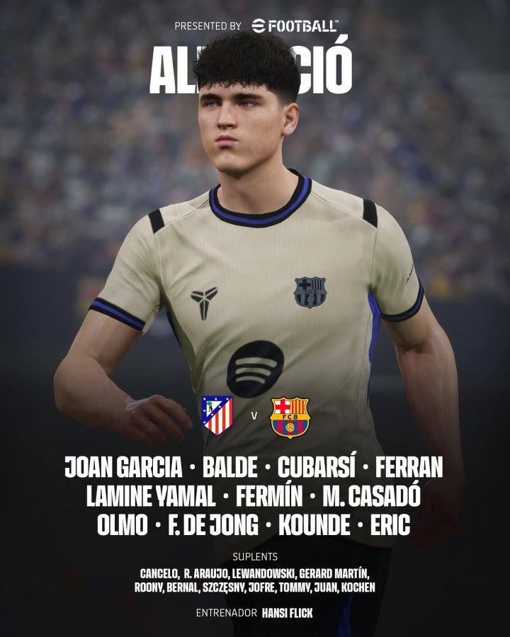 巴塞罗那首发:13-霍安-加西亚、3-巴尔德、24-埃里克-加西亚、5-库巴西、23-孔德、16-费尔明、21-德容、17-卡萨多、20-奥尔莫、7-费兰、10-亚马尔