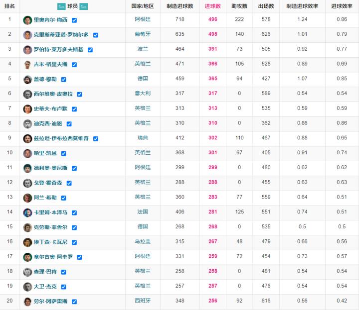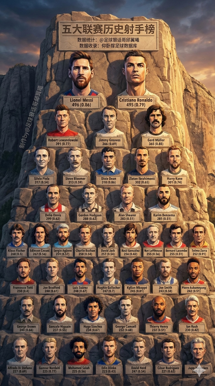 足球狠话哥带来一份独家榜单,揭开五大联赛历史射手的神秘面纱。皮奥拉在意甲的官方进球数是274个,不过加上1943-44和1944-45两个特殊赛季的数据,总共是317个,这个版本得到了IFFHS的认可。 第一排:梅西以496球(0.86)领跑,紧随其后的是C罗的495球(0.79)。 第二排:莱万391球(0.77),格里夫斯366球(0.69),穆勒365球(0.85)。 第三排:皮奥拉317球(0.54),布鲁默313球(0.59),迪恩310球(0.86),伊布302球(0.65),凯恩301球(0.74)。 第四排:奥尼斯299球(0.62),霍奇森288球(0.63),希勒283球(0.51),本泽马281球(0.51)。 第五排:菲舍尔268球(0.5),卡瓦尼267球(0.56),阿圭罗259球(0.57),布坎258球(0.54),杰克257球(0.54),劳尔256球(0.42),洛夫特豪斯255球(0.56),拉孔布255球(0.51),萨拉252球(0.91)。 第六排:托蒂250球(0.4),布拉德福德248球(0.61),苏亚雷斯248球(0.67),加拉赫247球(0.7),姆巴佩245球(0.81),史密斯243球(0.58),奥巴梅扬242球(0.51)。 第七排:布朗240球(0.66),伊瓜因237球(0.55),桑切斯234球(0.67),坎塞尔232球(0.68),亨利232球(0.51),拉什230球(0.42)。 第八排:迪斯蒂法诺227球(0.69),诺达尔225球(0.77),萨拉赫225球(0.56),哲科223球(0.43),赫德247球(0.54),罗德里格斯221球(0.63),海因克斯220球(0.6)。