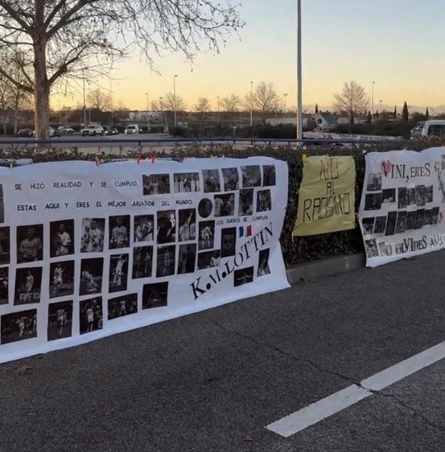 2月20日,皇马体育城外,球迷们高举横幅支持维尼修斯和姆巴佩,他们用行动力挺二人,反对种族歧视。