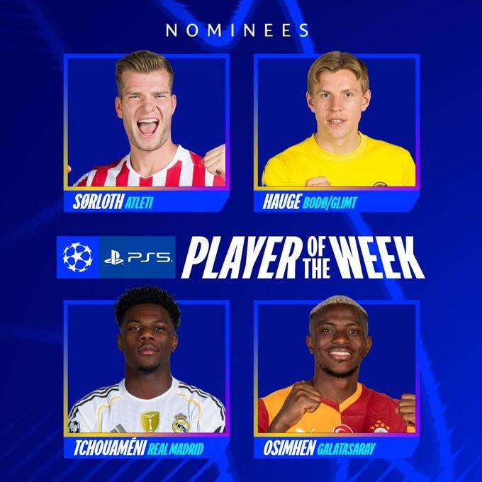 欧冠淘汰赛附加赛次回合刚结束,官方公布了本周最佳球员候选名单,其中有瑟洛特、海于格、楚阿梅尼和奥斯梅恩。谁能最终问鼎呢?