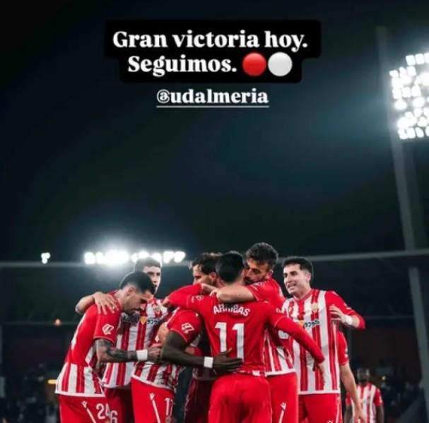 对此C罗在社交媒体上,向自己刚入股不久的阿尔梅里亚送上寄语。他配了一张球队的进球庆祝照,并写道:“伟大的胜利。继续前进,阿尔梅里亚。”