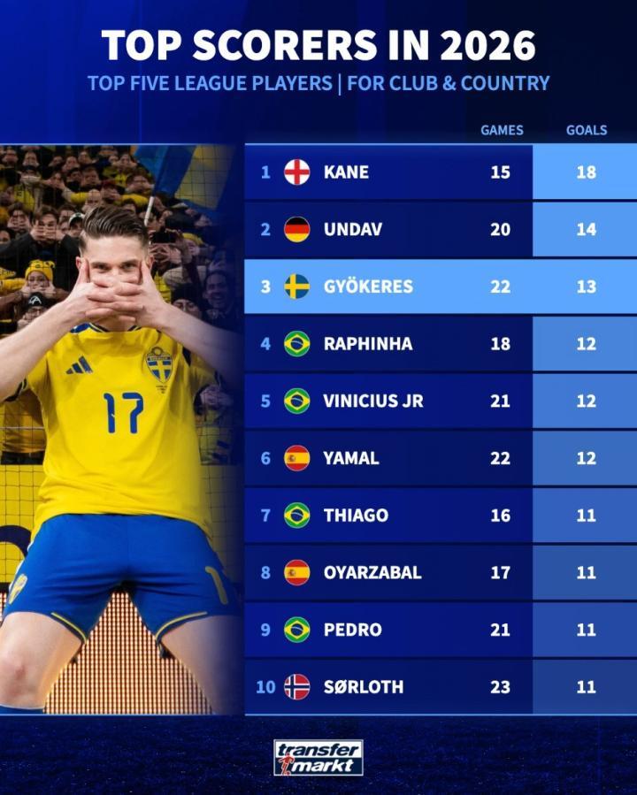 北京时间4月2号,德国转会市场有个数据挺有意思,他们盘点了今年欧洲五大联赛的球员,算上国家队和俱乐部比赛,谁的进球最多,排第一的是哈里-凯恩,他踢了15场,进了18个球,还有一个球员叫哲凯赖什,他进了13个球排在第三,说起来,他之前在世预赛附加赛决赛里进过球,帮瑞典队拿到了世界杯门票。