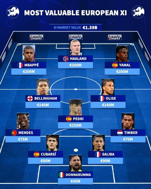 在这位西班牙人身前,是英格兰的贝林厄姆(1.4亿欧元)和法国的奥利塞(1.4亿欧元)。右边锋位置由亚马尔(2亿欧元)占据,左边锋则是法国的姆巴佩(2亿欧元),中锋位置由挪威的哈兰德(2亿欧元)担任。这套阵容中,西班牙和法国是最具统治力的两个国家,均有三名球员入选,阵容总身价高达惊人的13.9亿欧元。