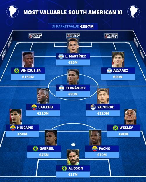 南美队的门将位置由经验丰富的巴西门将阿利松(1700万欧元)占据。后防线由两名巴西人和两名厄瓜多尔人组成:左后卫是因卡皮耶(5000万欧元),他的阿森纳队友加布里埃尔(7500万欧元)与威廉-帕乔(7000万欧元)搭档中后卫,韦斯利(4000万欧元)出任右后卫。厄瓜多尔人莫伊塞斯-凯塞多(1.1亿欧元)和乌拉圭人巴尔韦德(1.2亿欧元)出任中前卫。