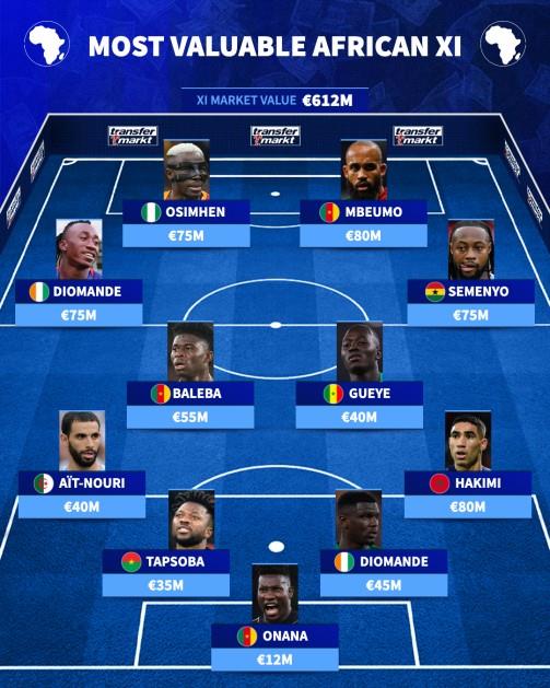 右边锋是加纳人塞门约(7500万欧元),左边锋则是近期身价暴涨3000多万欧元的17岁科特迪瓦小将扬-迪奥曼德。锋线上,尼日利亚人奥斯梅恩(7500万欧元)——他将无缘本届世界杯——与喀麦隆人姆伯莫(8000万欧元)搭档。喀麦隆是这套阵容中最具统治力的国家,有三名球员入选,整套阵容的总身价为6.12亿欧元。