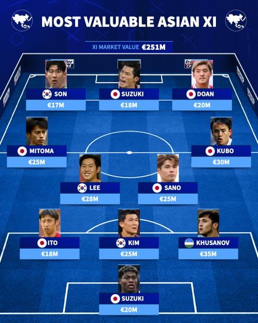 右中场是久保建英(3000万欧元),左中场是三笘薰(2500万欧元),两人均来自日本队。韩国传奇球星孙兴慜(1700万欧元)与日本球星铃木唯人(1800万欧元)、堂安律(2000万欧元)组成前场三人组。日本是这套阵容中最具统治力的国家,共有七名球员入选,整套阵容的总身价为2.51亿欧元。