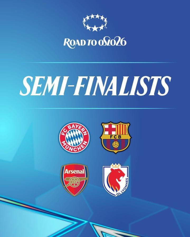 2025-26赛季女足欧冠1/4决赛结束,晋级的球队分别是巴萨、拜仁、里昂和阿森纳。半决赛对阵情况为巴萨对阵拜仁,里昂迎战阿森纳。