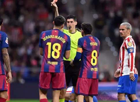 这场焦点战的争议核心发生在下半场开场不久,当时比分仍为1比1,比赛走势处于关键转折点,巴萨后卫赫拉德·马丁在中场附近与马竞新援蒂亚戈·阿尔马达争抢皮球,马丁先是伸脚触碰到球,但随后没有收脚,其右脚鞋钉清晰地蹬踏在阿尔马达的脚踝部位,动作幅度大且具有明显危险性。当值主裁判马特奥·布斯克茨·费雷尔第一时间直接掏出红牌,将马丁罚下,这一判罚符合西甲关于严重犯规的规则,也得到现场马竞球员与球迷的认可,然而VAR裁判马里奥·梅莱罗·洛佩斯迅速介入,通过耳麦提醒主裁到场边回看录像,并给出倾向性意见,认为马丁是先触球后的自然接触,不属于严重犯规,建议取消红牌。布斯克茨在观看回放后,当场推翻原判,将红牌改为黄牌,这一改判瞬间让大都会球场嘘声震天,马竞主帅西蒙尼在场边暴怒,不断向第四官员抗议,球员们也围拢向裁判表达不满,比赛因此中断近五分钟。