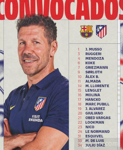 前锋:19-胡利安-阿尔瓦雷斯、22-卢克曼、9-瑟洛特、10-巴埃纳、11-蒂亚戈-阿尔马达、20-朱利亚诺-西蒙尼、7-格列兹曼、23-尼古拉斯-冈萨雷斯