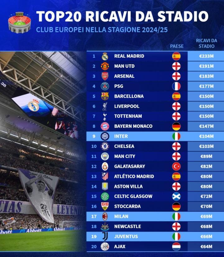 上赛季欧洲俱乐部门票收入排名,皇马2.33亿居首,曼联和阿森纳紧随其后