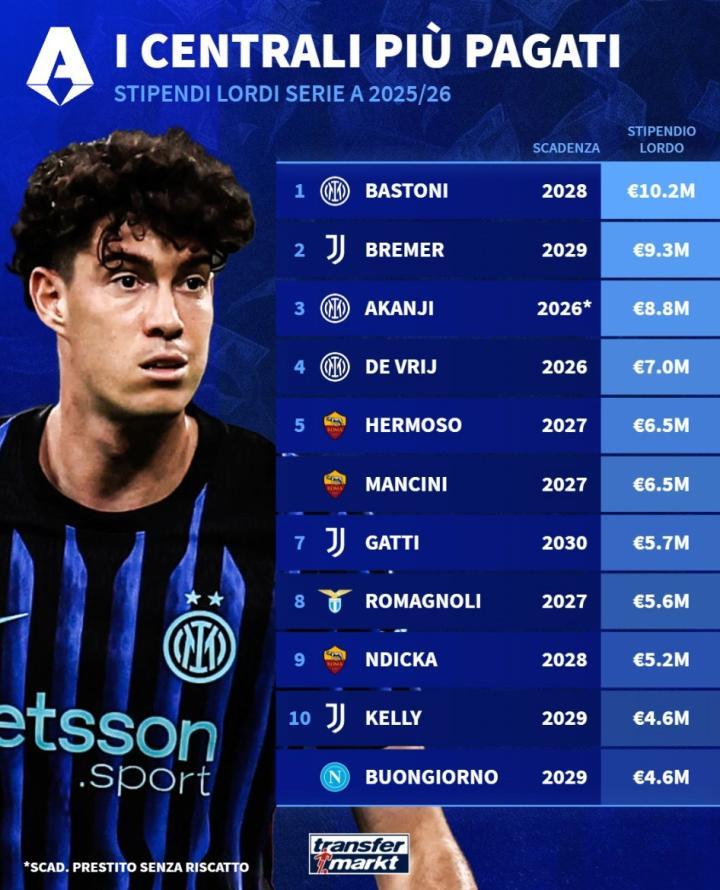本赛季意甲中卫年薪排行,巴斯托尼1020万欧居首,布雷默930万欧紧随其后