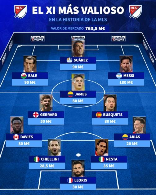 2月21日,德转公布了一份美职联球员历史最高身价的11人阵容,梅西以1.8亿欧元高居榜首,阵容中还有苏亚雷斯、贝尔、哈梅斯-罗德里格斯、杰拉德和内斯塔等球星。