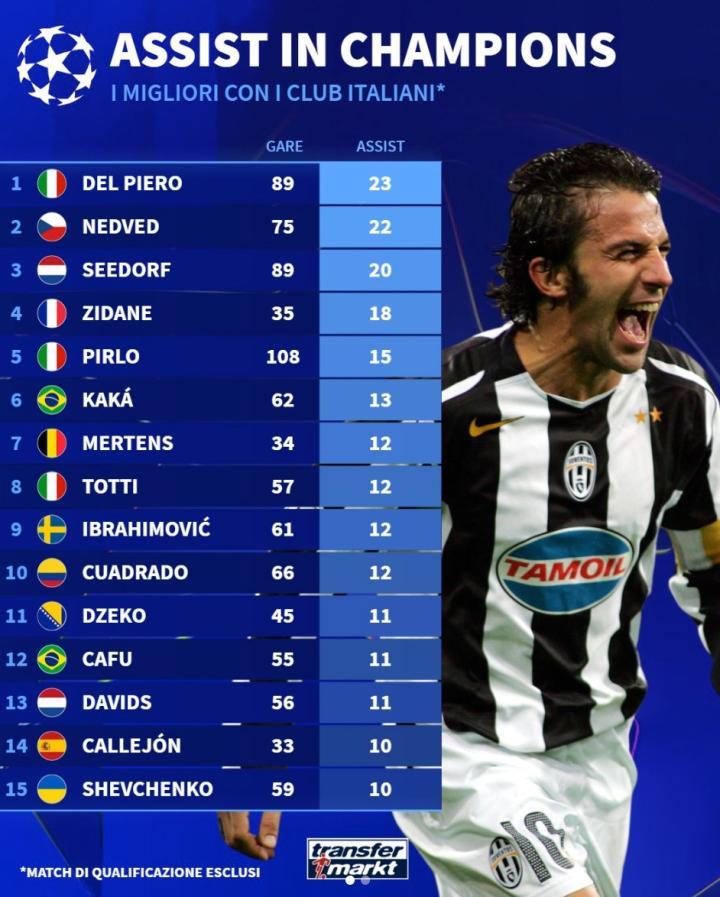 意甲球员欧冠历史助攻榜,皮耶罗、内德维德、西多夫位列前三