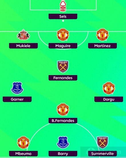 中场:詹姆斯-加纳(埃弗顿)、马特乌斯-费尔南德斯(西汉姆联)、B费(曼联)、多古(曼联)