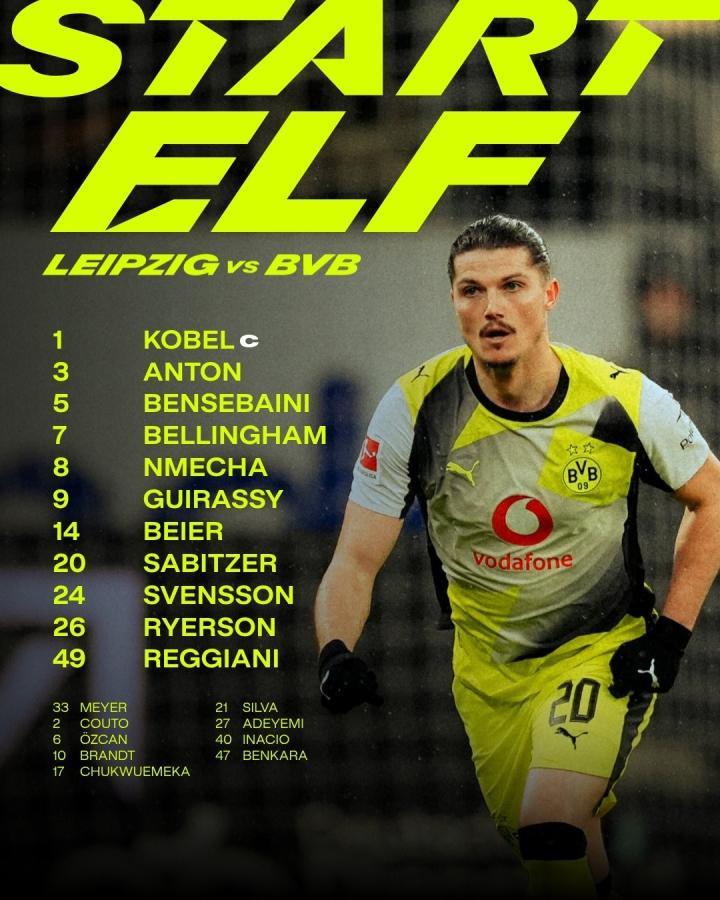 多特首发:1-科贝尔、3-安东、5-本塞拜尼、49-雷贾尼、24-斯文松、20-萨比策、7-乔布-贝林厄姆、8-恩梅加、26-瑞尔森、14-拜尔、9-吉拉西