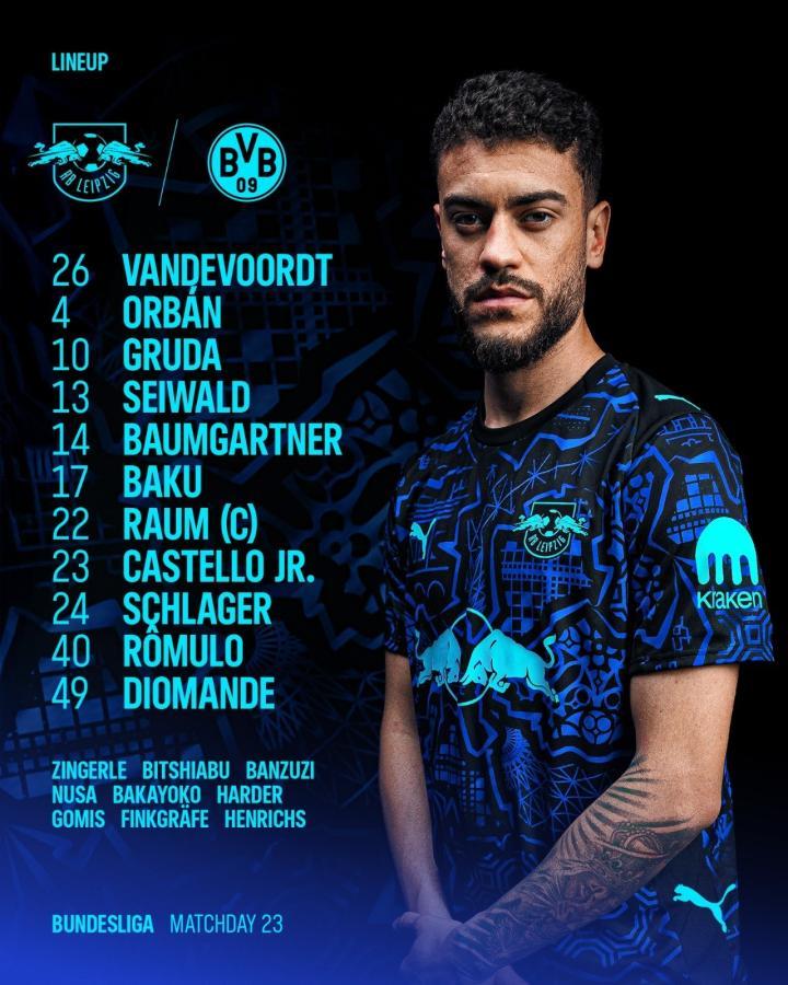 莱比锡首发:24-范德沃德、22-劳姆、23-卢克巴、4-奥尔班、17-巴库、24-施拉格尔、13-赛瓦尔德、14-鲍姆加特纳、10-格鲁达、40-罗慕洛、49-迪奥曼德