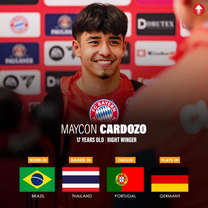 在对阵门兴的比赛中,17岁的拜仁小将梅孔-卡多佐迎来了他在一线队的首次亮相,据了解,他拥有代表泰国、巴西和葡萄牙三国参赛的资格。
