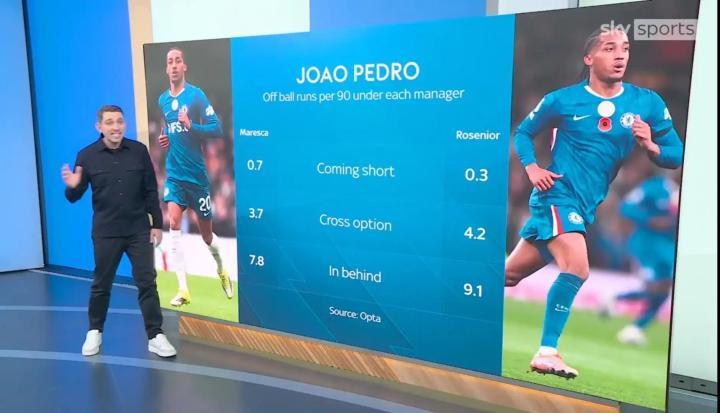 天空体育最近做了个数据对比,看看若昂-佩德罗在两位主帅手下的表现,马雷斯卡那时候和罗塞尼尔上任后,他的活动热区图变化挺明显的。