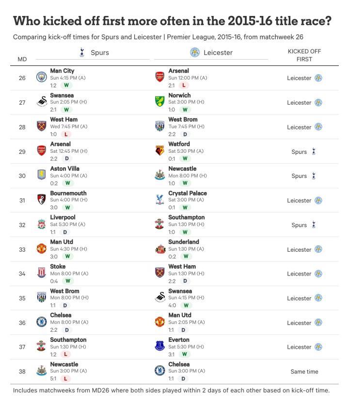 “他们似乎每个周末都比我们先赛,当他们赢了的时候,那感觉就像一记重拳。如果是一个绝杀球,或者是在第90分钟连进两球,那就会产生影响,”当时的热刺球员埃里克-戴尔在接受加里-内维尔采访时告诉The Overlap。哈里-凯恩也赞同这一观点。“我们似乎总是最后比赛的球队,”他在4月中旬一个周一晚上热刺客场4-0战胜斯托克城后说道,而莱斯特城在前一天下午刚刚对阵了西汉姆联。