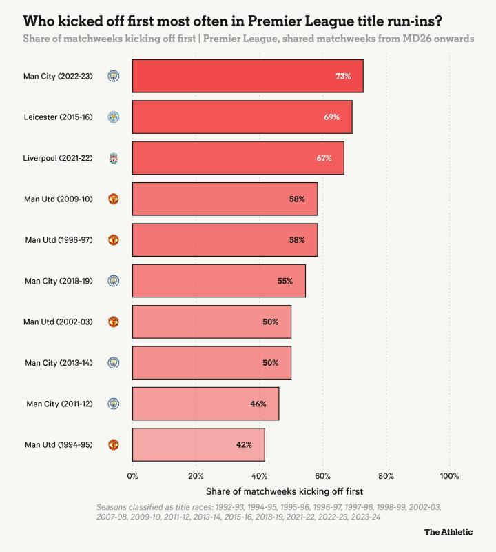 在这里,冠军冲刺阶段指的是冠军归属在后期仍然真正存在悬念的赛季(如下图脚注所列),不包括像2024-25赛季那样的“巡游”,当时利物浦轻松夺冠,最终领先阿森纳10分。