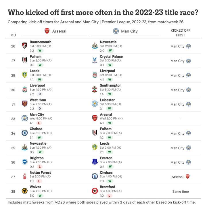 在2022-23赛季的冲刺阶段比赛中,曼城在73%的比赛中先赛,他们追上了阿森纳8分的领先优势,连续第三年赢得联赛冠军,也是六个赛季中的第五次。