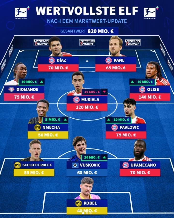 德甲最新身价榜出来了,拜仁这次真是大赢家,直接占了6个位置,多特那边也有3位球员入选,最抢眼的还得是奥利塞,他的身价飙到了1亿4000万欧元,直接领跑整个榜单。