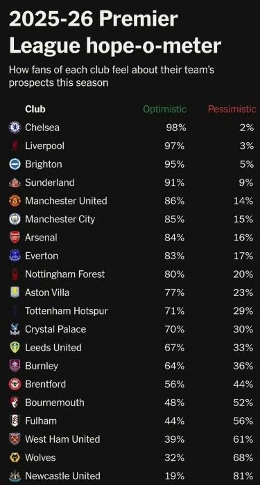 赛季初,切尔西刚拿下世俱杯冠军,球迷的乐观指数飙到98%,高居英超榜首。但如今,因队内外问题不断,这一数据已跌至7.6%,垫底英超。