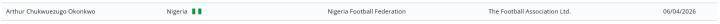 国际足联那边更新了球员信息,奥孔库沃现在正式代表尼日利亚了,他是阿森纳青训出来的门将。